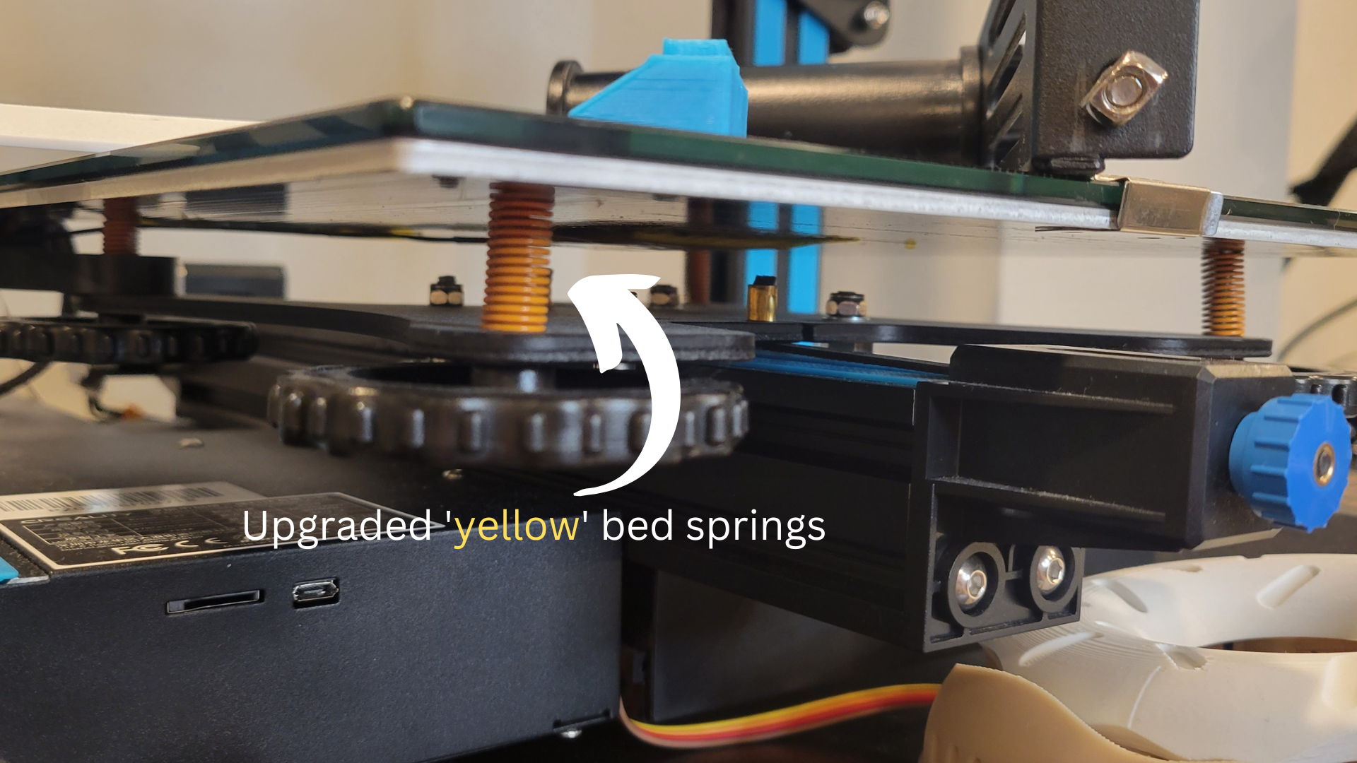 If you don’t know this already the end all be all of printer calibrations is leveling your print bed. The items that keep your bed level are the springs. Stock bed springs offer moderate tension and can distort over time, meaning you’ll be re-leveling your bed more often than you’d want. Upgraded bed springs, usually yellow in color, off a stiffer spring which should keep your bed at a more consistent level over a longer period of time = leveling your bed less.
